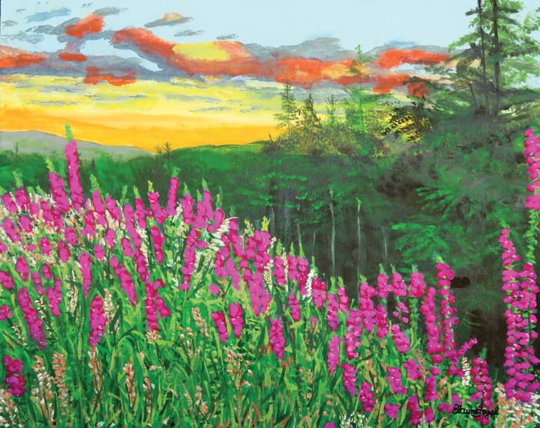 The painting showcases a lush wildflower meadow brimming with vivid magenta and pink foxgloves. Behind the flower field, a dense green forest stretches into the distance. Fiery clouds intermingle with cooler shades of gray and blue, while golden light streaks the horizon — evoking a fleeting moment ...