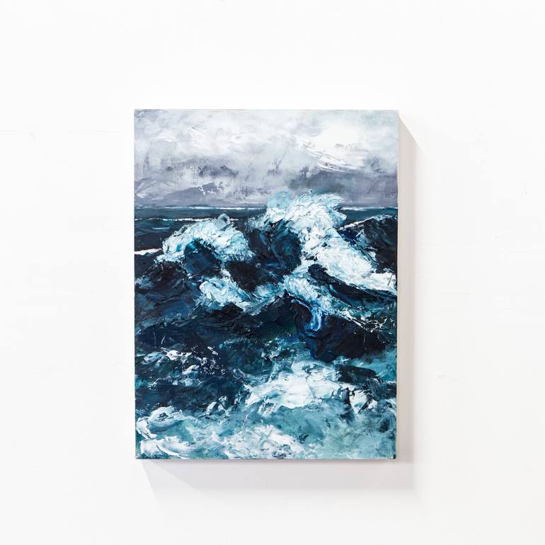 Sea Power is an original painting on panel of stormy waves. The sky has been sanded down and emphasizes the bold texture of the waves in the foreground. A dramatic contrast between the dominant skies and the minimal horizon challenges the viewer to find stillness within commotion and disaster. The o...