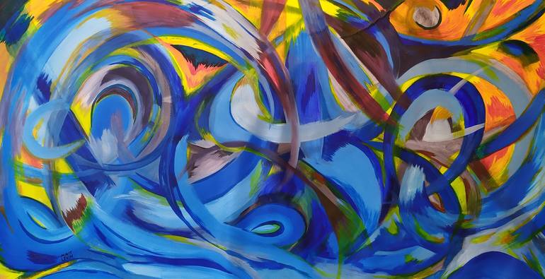This abstract blue canvas painting was created using acrylics. It features an array of blues and some yellow in motion. This oversized water & sun element painting deserved a large wall in your home all to itself. It would be perfect in a living room or bedroom. Name: Sea & Sun Size: 55" X 28" inche...