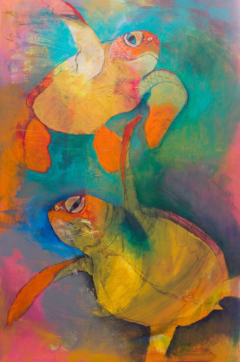 This particular painting is different from my others in that the image/s didn't emerge. I had an picture of sea turtles that I really wanted to paint. The shape of the canvas seemed perfect, so I "imposed" the image on the abstract canvas. I've imposed images before without success. This particular ...