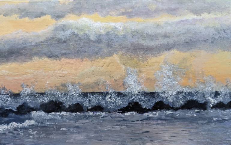 Seascape, splashes of waves breaking on coastal rocks against the backdrop of the sunset sky. Needs frame. Comes with certificate.
