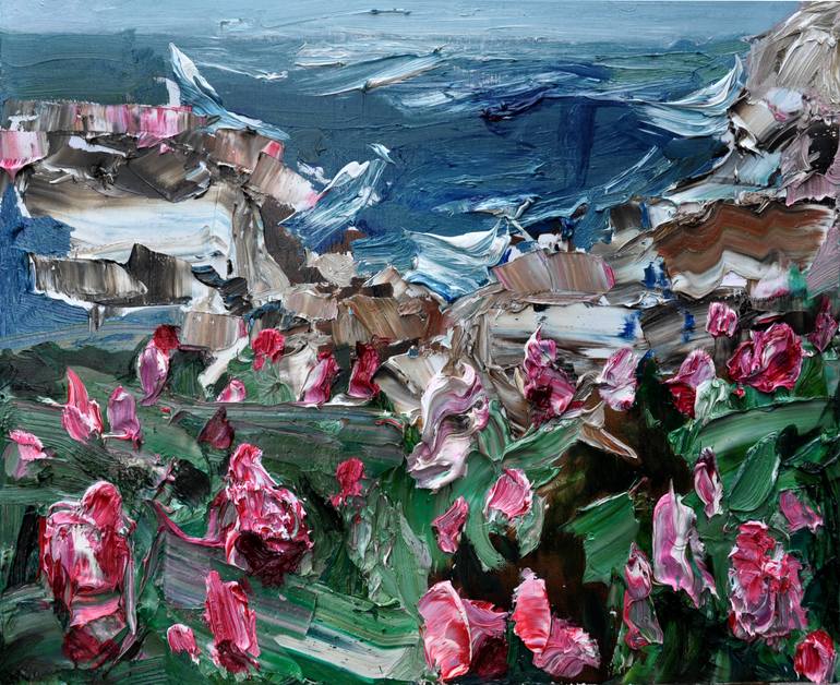 CURRENTLY ON EXHIBITION, WILL BE AVAILABLE FOR PURCHASE SOON This painitng was inspired by the contrast between the sea, the rocks and the spring flowers. I use spatulas to create a rich textures. Oil painting on canvas.