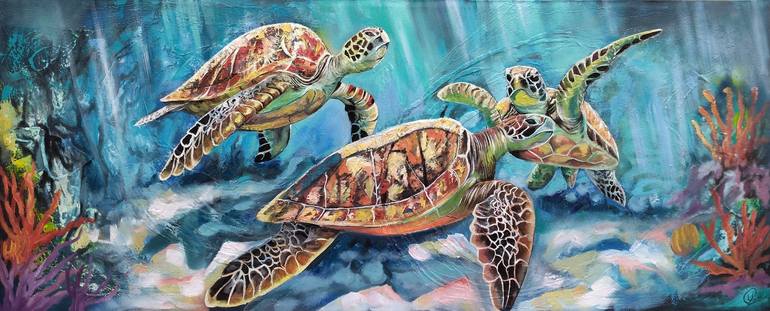 This painting depicts a vibrant and lively underwater scene, featuring three sea turtles swimming in an oceanic environment. The turtles are detailed in warm colors such as orange, brown and yellow tones, contrasting with the background in cool tones such as blue and green. The background suggests ...