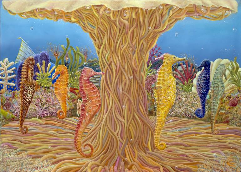 Painting: Oil on Canvas. The theme is based on a fun fair, something that brings back happy memories for many of us. Only, this is in another world, under the waves which can be fun as well. I thought of using the attractive seahorses bopping around in the same manner as we use the figures on a rea...