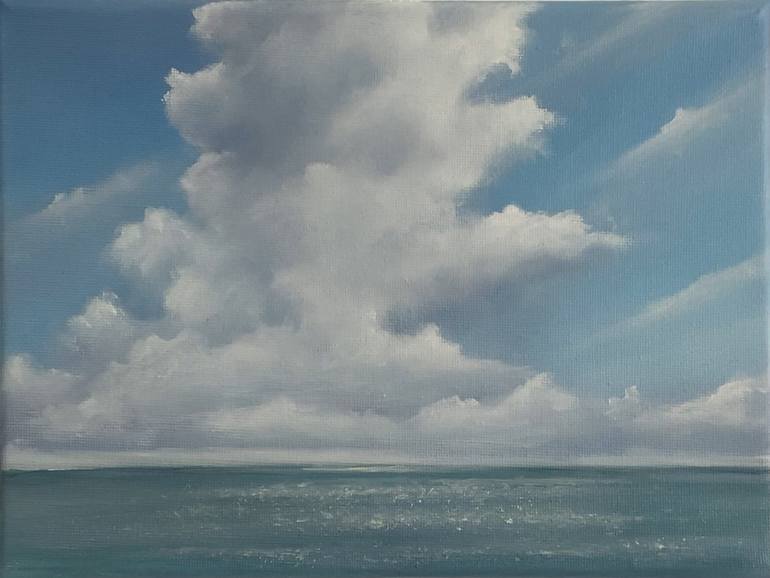 This evocative seascape captures the serene expanse of the ocean meeting a vast sky adorned with billowing clouds. Soft, wispy brushstrokes blend hues of blue and white, illustrating the dynamic energy of nature in a moment of calm. The intricate detailing of the sunlight reflecting off the rippling...