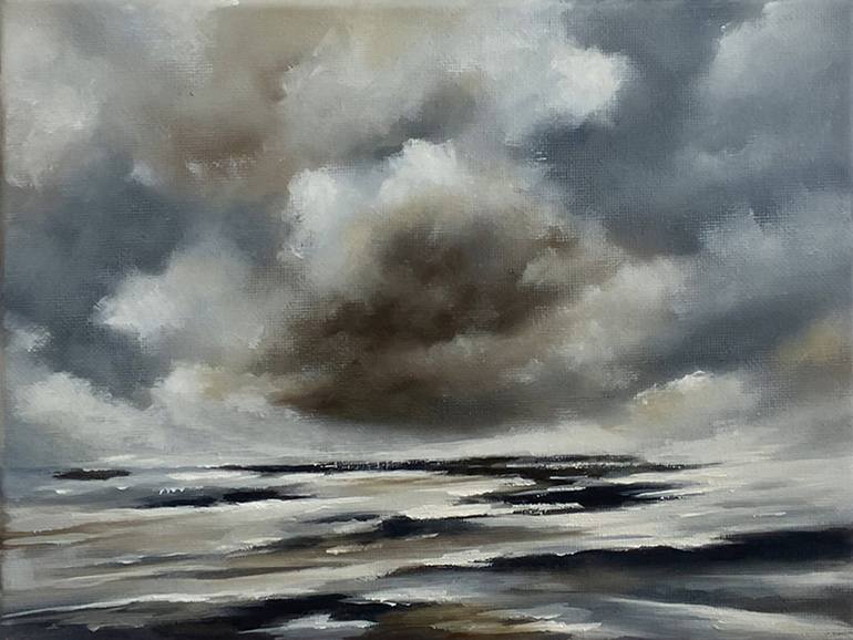 This evocative oil painting captures the raw power and tumultuous beauty of a storm over a vast seascape. The interplay of light and shadow dances across the canvas, with dark, brooding clouds dominating the sky, hinting at nature’s unrelenting force. Subtle yet dramatic waves ripple across the ocea...