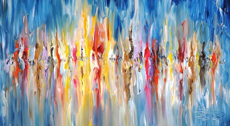 Painting: Acrylic on Canvas. Abstract seaside art. Large abstract painting. Original abstract expressionism art. 61.0" width x 33.5" height x 1.5" depth. (155 cm Breite x 85 cm Höhe x 3,8 cm Keilrahmenstärke) Blue, lilac, lavender, yellow, red, white, turquoise, orange, magenta, sienna, brown. Mod...