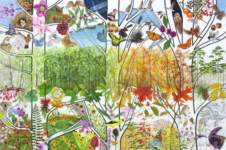 Trena McNabb creates intricate and layered paintings she has researched with the ardor and interest of a natural scientist. Although each subject is represented realistically, because she employs transparency, overlap, and changes in scale, the overall effect of the piece is somewhat surreal. Often described as “transparent, painted collages, a connected series of smaller paintings that tell a story. Her artistic resume is extensive, spanning over three decades and including a host of community projects as well as over 45 selected exhibitions. Trena’s painting style has been described as a transparent, painted collage—forming a kaleidoscope of vivid colors that still retain a lifelike quality. The overlapping images she creates around one central theme combine to tell a story, and draw the viewer in with surreal and colorful forms which become shockingly realistic when viewed up close. Trena has always enjoy painting big and these commissions gave her an opportunity. She likes doing research and telling a story using her own unique technique. Her prior work ranges from 32-foot long multi-canvas, site-specific corporate, hospitals and/or public art commissions to small pieces for private residences. Her paintings can be found throughout the US, Europe and Asia, all telling the story or history of that particular environment, industry or community. The natural world and the images from nature, native plants, insects and animals associated with particular areas have become her signature works. “Looking at Trena McNabb’s paintings is a journey into ourselves. Her flawless compositions and thoughtful renderings thoroughly engage the viewer. She allows us to glimpse the unseeable aspects of life through her portrayals of real things. Joyful and intellectual, Trena McNabb’s paintings are the inspired work of an artist with much to say about the richness of our lives.” Gallery Director Trena grew up in a small town in North Carolina with a passion for reading and art. As a child she loved to draw and became aware that it was possible to make a living as an artist as she grew older. She began using her artistic talents to earn a living as an award winning commercial art director. Leaving that world to paint full-time in 1995, she began to include my love of nature in my work. She creates large unusual landscapes utilizing the overlapping and transparent style she developed. Her paintings can be found throughout the US, Europe and Asia.