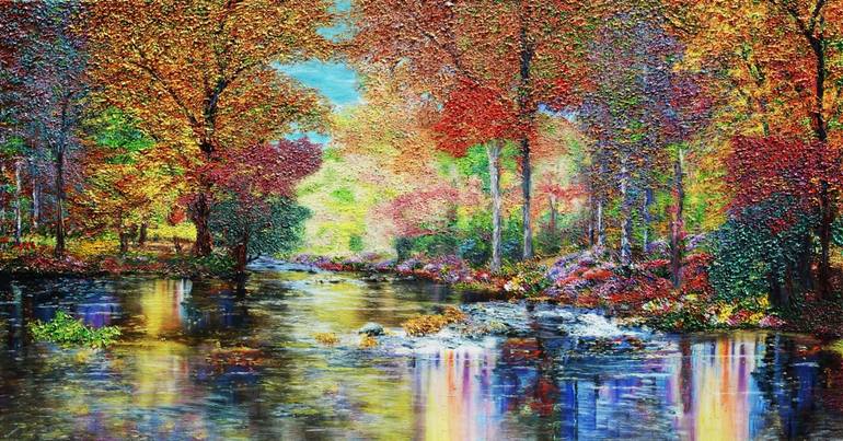 “Oftentimes one has to get off the beaten track to discover secret treasures and this was the case when I discovered this scene in Northern California.” A splendid oil on canvas example of nature’s brilliance is this forest river scene. The slow journey suddenly picks up pace as the river accelerat...
