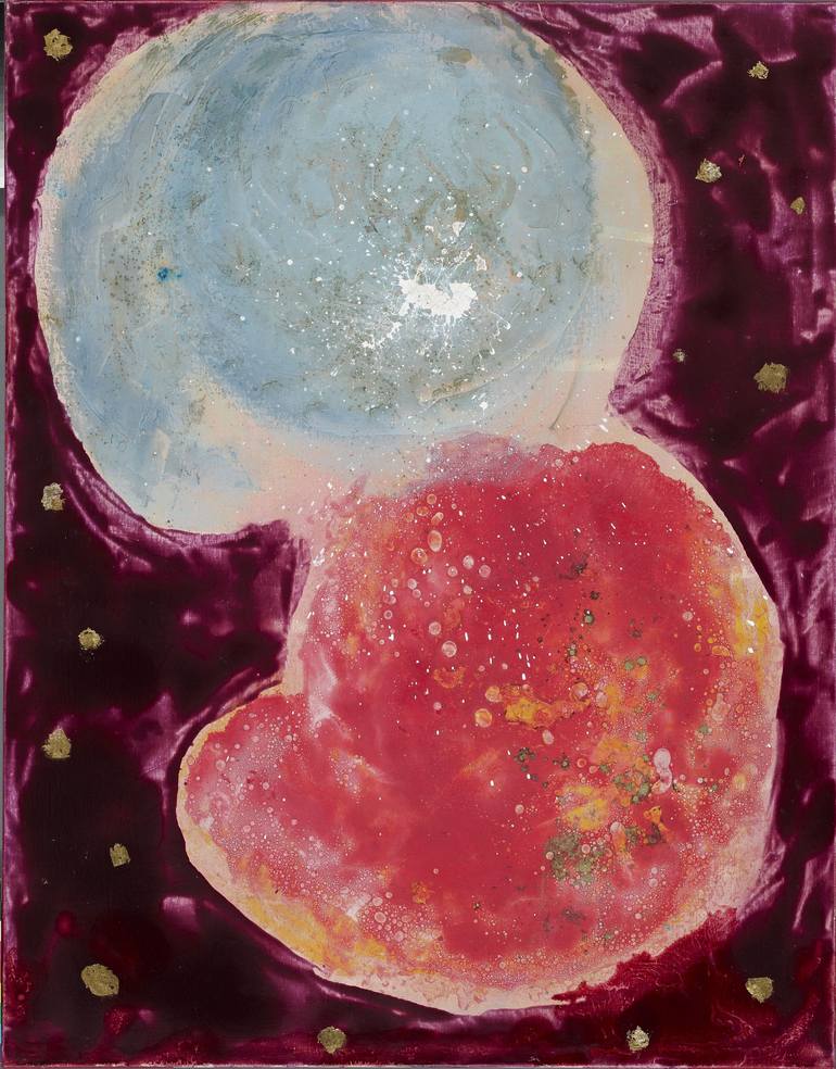 Oil,acrylic color on canvas with gold foil. Like two pearls on a purple red silk: ''There is a secret between us,don't tell ! '' The color of the wood frame is very special and beautiful,it's black color underneath as tone with gold color powder.(please see the picture)