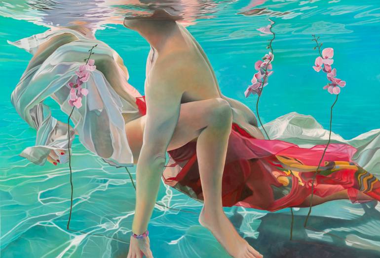 Josep Moncada (Maó 1967) is an artist who looks into the depth of the aquatic world to visualize and paint a reality that blurs into a thousand shapes and colors, becoming an instant of charm and fascination. He is a conjurer who photographically captures a microsecond of the magic and mysteries that appear underwater, with the power to capture them on canvas and with the virtue of moving even the most neophyte viewer in art. Perhaps influenced by his zodiac sign, this Pisces explores the underwater universe and, at the same time, relates to the subconscious and that hidden dimension that beats below the threshold of what is attainable and what exists. His works are moments of a situation in constant evolution. In his paintings, moments are reflected that would go unnoticed if they were not collected and examined by his inquisitive eyes to, immediately afterwards, stamp them and immortalize them on a canvas with his color palette. A job identical to that of a psychoanalyst when he scrutinizes his patient's subconscious. In this sense, it is no coincidence that the background tones that predominate in his creations are turquoise blue together with green in its different shades. Colors coming from the refreshing and relaxing waters of the Mediterranean that bathe wonderful corners on the island of Menorca. Josep carries in his collective unconscious that color that in other cultures and times was sacred and used in rituals and ceremonies as it represents the most emotional and inspiring side, very much in harmony with his creative mind and his most sensitive personality. The sea with its movement, its glow and its light is a sedative of emotions and thoughts, it cleanses the mind and invites you to start again with renewed strength, as he himself does every time he starts a new production: calm is followed by inspiration. In his subliminal art, the scenes are led by figures that break up with objects that get in the way and that enhance impossible realities with shocking colors. The whole set with amazing and magical results, leaving a work of evident emotion and beauty that, without a doubt, leaves no one indifferent.