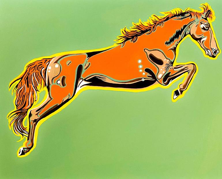 Still capture of a horse pre-arch of a leap. Simplified shapes with extraordinary colors.