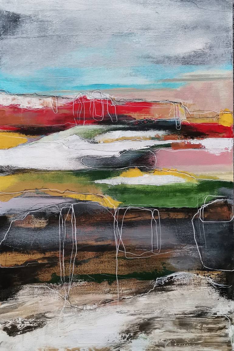 Acrylic on Canvas. Abstract interpretation of a very colourful landscape but yet again I would like to leave interpretation to the viewer . Thank you for watching and I hope you will see something very striking to your eye in this image.