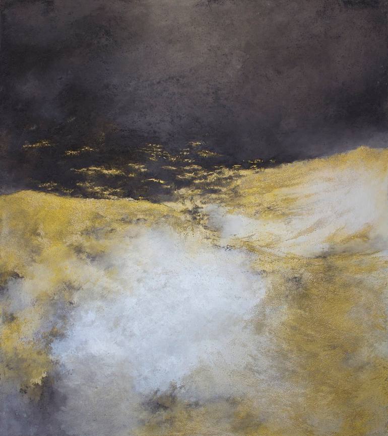 This painting represents for me the elegy and power I feel early in the morning, when the sun rises over a cloudy and moody sky. It makes me feel energised and ready for a new day. This original mixed media artwork is made with acrylic colors, gesso, resins mixed with sands and golden metallic pig...