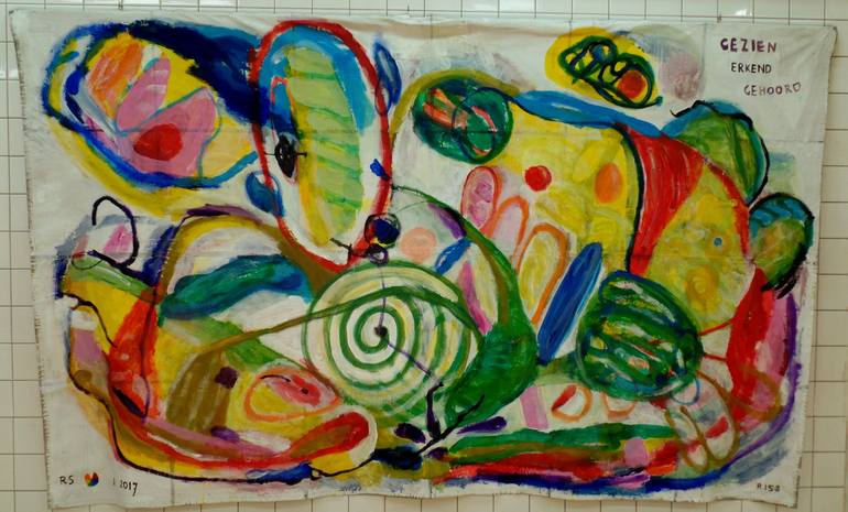 Seen, acknowledged, heard, R 158 This painting started with a color sketch during a meditation session. It is a more or less exact enlargement of that sketch. Iki squared the sketch. You divide the sketch into small blocks and you enlarge them by a factor. You can still see the guides. I painted a ...