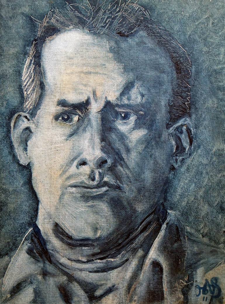 Some bright spark told me to do a picture in just one colour. SO - this is my effort in Prussian Blue oil paint on 16 x 12 inch canvas board in 45 minutes. Bit of scratching back, 'watering down' the paint etc. Face a bit squished and clearly not very happy that day! Normally a happier soul. Not sur...