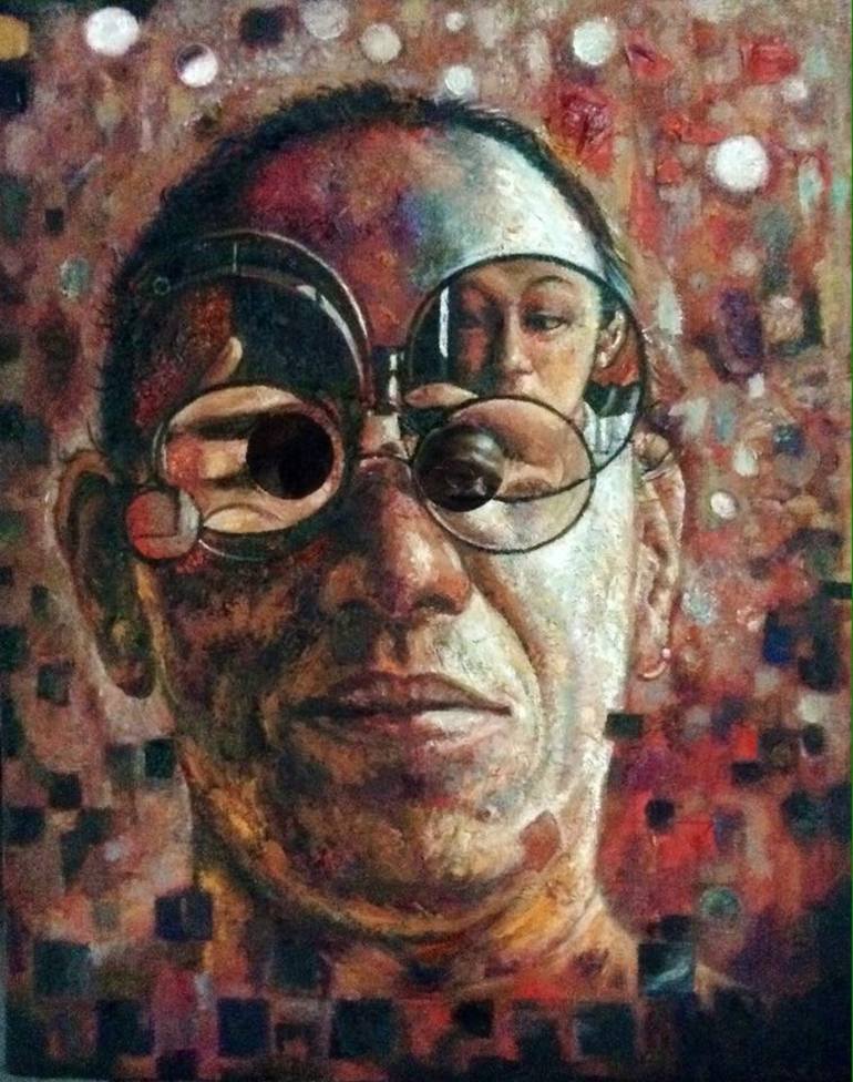 A self portrait that was not planned at all. It came about by merely tinkering what to do with: a large amount of excess red paint laying on my palette, and, a found pair of small round mirrors in hand.