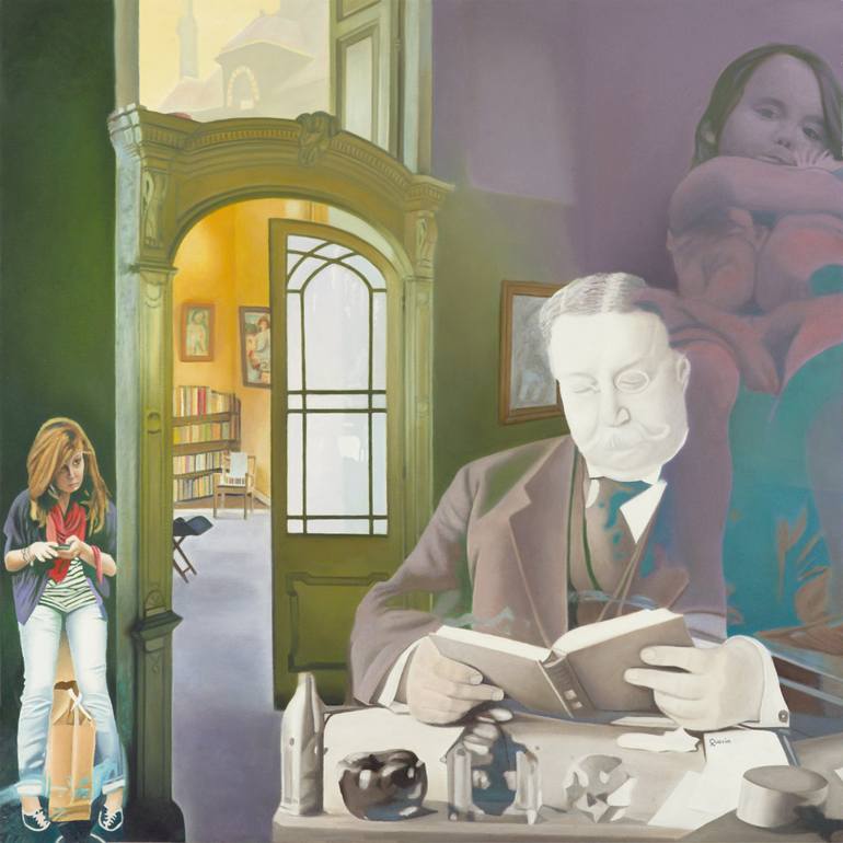 In the painting the artist deals with the theme of generations, separated by different lifestyles that determine an internal conflict. In the painting the artist plays with overlaps, creating space-time paradoxes, and representing things and characters in a very realistic way, which he inserts in an...