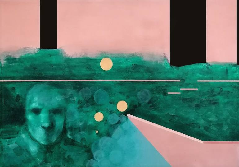 The painting describes the universe that thinks and designs nature. Through projected will, the universe creates reality and forms life, a primordial life that moves in the register of what is allowed to be known and explored. From primordial elements, particles aggregate, shaping man, a man who is ...
