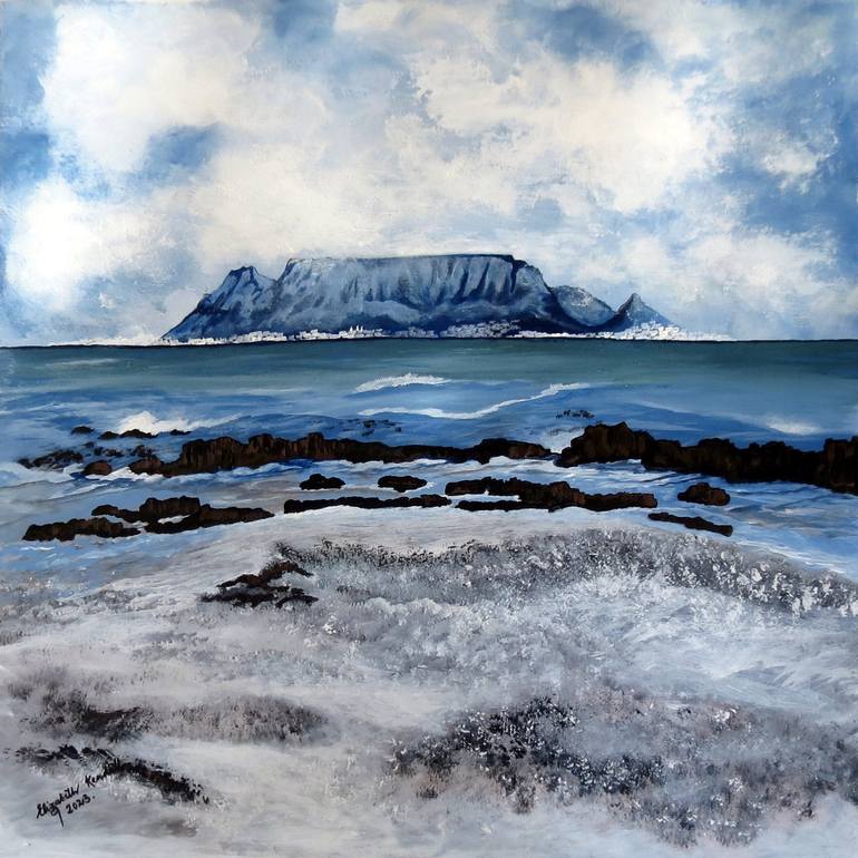 Inspired by a breathtaking moment during my holiday in South Africa, this painting captures the majestic presence of Table Mountain rising above the sparkling sea, with waves gently meeting the rugged rocks and soft sands of the beach. The vivid blues of the ocean contrast with the earthy tones of t...