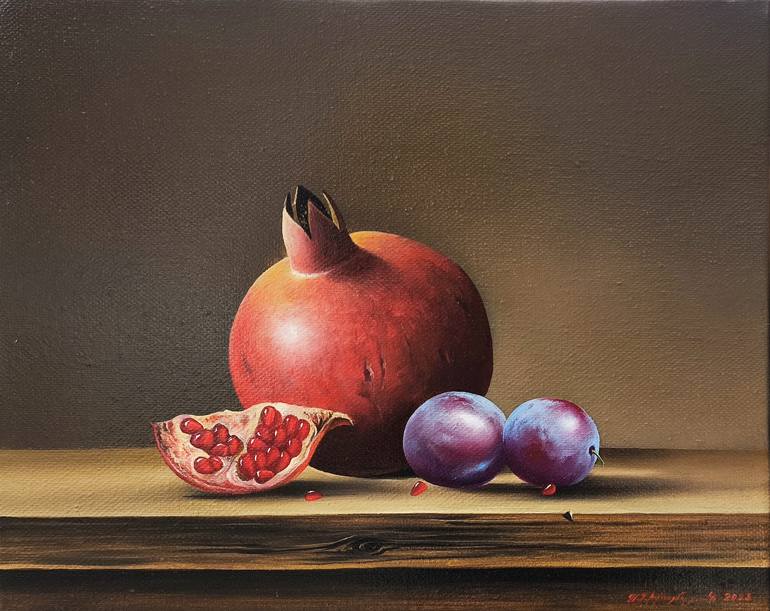 OIL/CANVAS Size - 24x30cm READY TO HANG Original oil painting, 100% hand painted on canvas. Come with signed certificate of authenticity. This exquisite still life painting masterfully captures the elegance and simplicity of nature’s offerings. A ripe pomegranate, rich in red hues, sits alongside ...