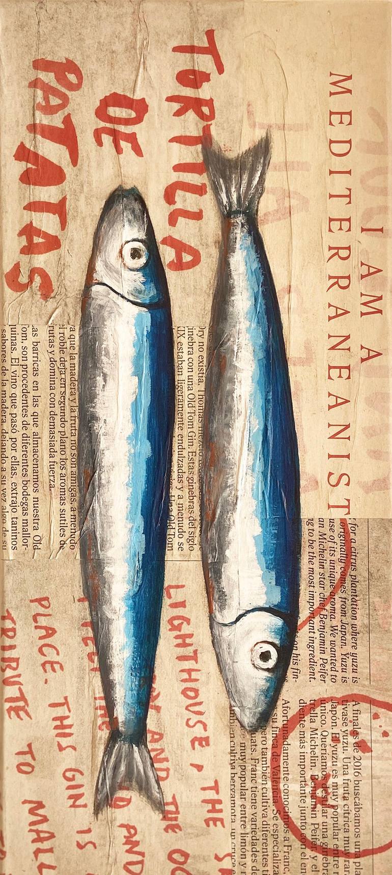 This series is inspired by my love for the sea and all that lives in it. This work is painted with acrylic on collage made with newspaper, treated with glue and varnish, on canvas..