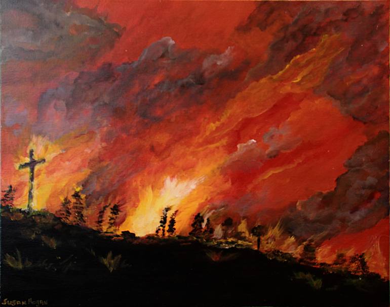 Inspired by the irony of natural destruction. Painted in acrylic on archival quality canvas. Signed front and back.