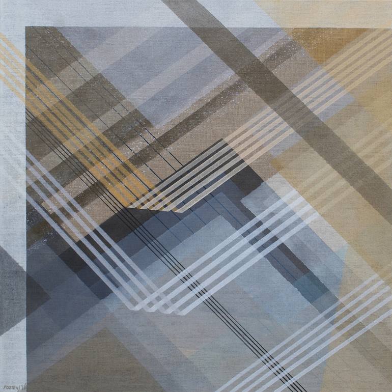 Painted on a raw linnen canvas with sparkling, metalic acrylics. Multiple layers and graphic lines give threedimentional look. Colors changes mood and look different depending on light during the day. Metalic paints gives also extra glamour look. From the "Constellations" collection.