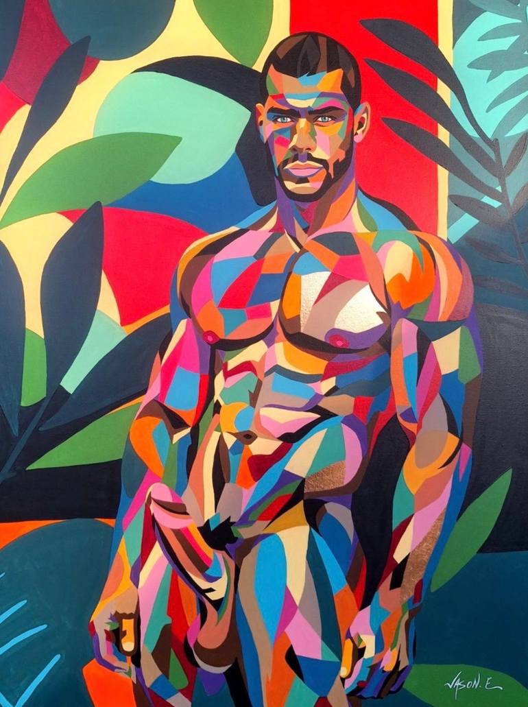 A brand new ORIGINAL oil painting of a muscular and handsome nude male with a large erect penis. Jungle theme. A very beautiful and unique geometric gay pride painting. Nice large size at 30x40 inches.