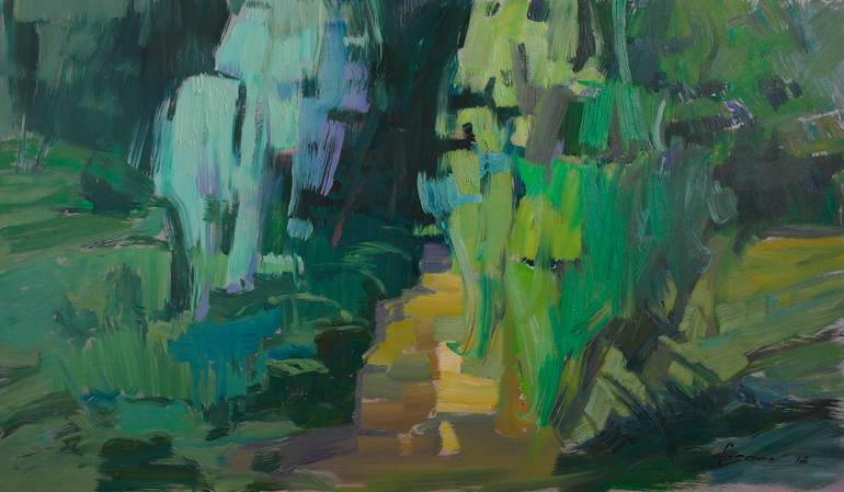 The picture shows shades of green colors in the hot summer season. А feature of the work is the virtuosity of conveying the shape of objects with the help of a wide confident brushstroke and temperature contrast of shades.