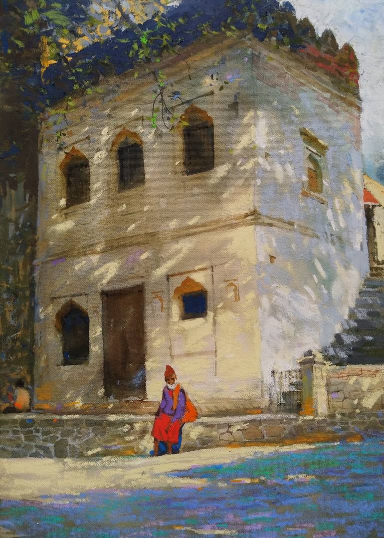 This work is done after visit to beautiful Maheshwar. This place is called ‘Laboos cafe’. It entrance of fort located on bank of Narmada river. Beautiful and calm place to visit and stay. In this painting I used watercolour and oil pastels to capture interesting play of shadows.