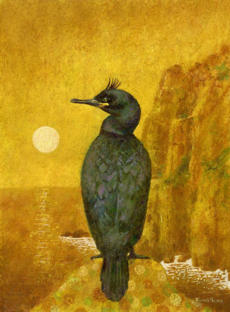 This stylized painting shows a Shag (seabird) against a coastal sunset scene. The original is painted in acrylic on plywood with the use of acrylic gold for the background..