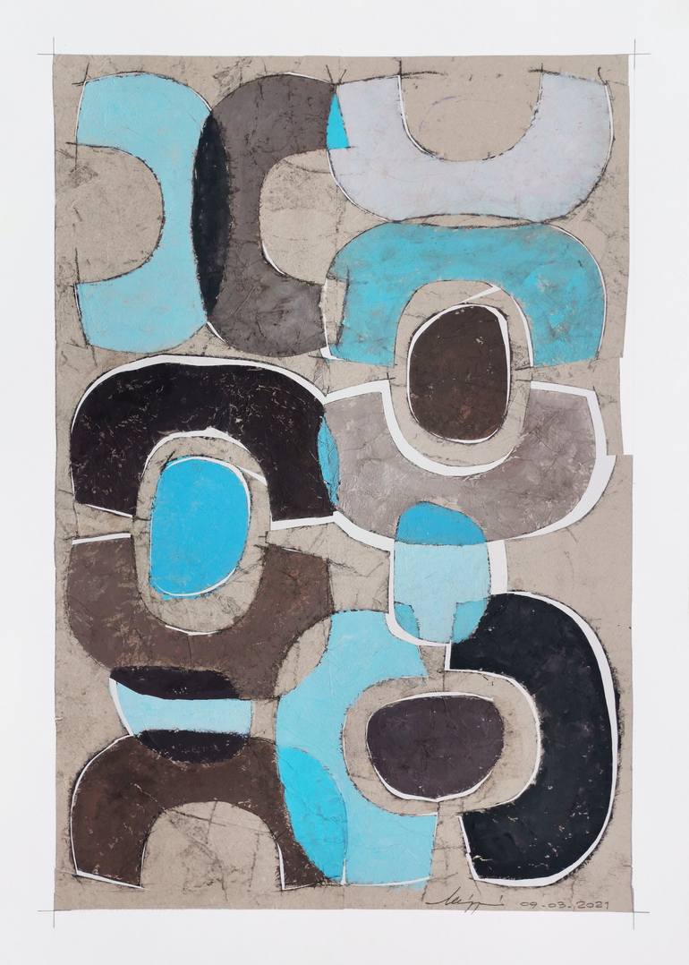 Shapes 066 is an acrylic painting on cardboard, cut and pasted onto a heavy watercolor paper background. With the use of personal and codified stylistic elements, I develop my personal expressive and compositional research with different material solutions in new and different relationships and form...