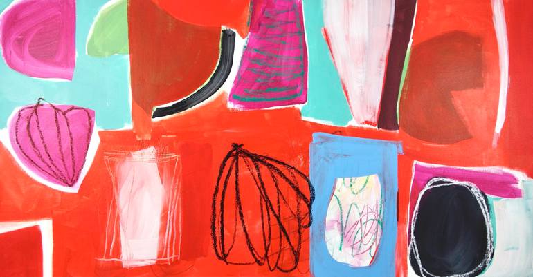 "Shapes" is from my "Elemental" series that expresses beginnings and evolution in the natural world on planet Earth. "Shapes (Elemental)," is a modern abstract of simple organic and geometric shapes and gestural lines. Red background is complemented and contrasted with bold, bright color, and black...