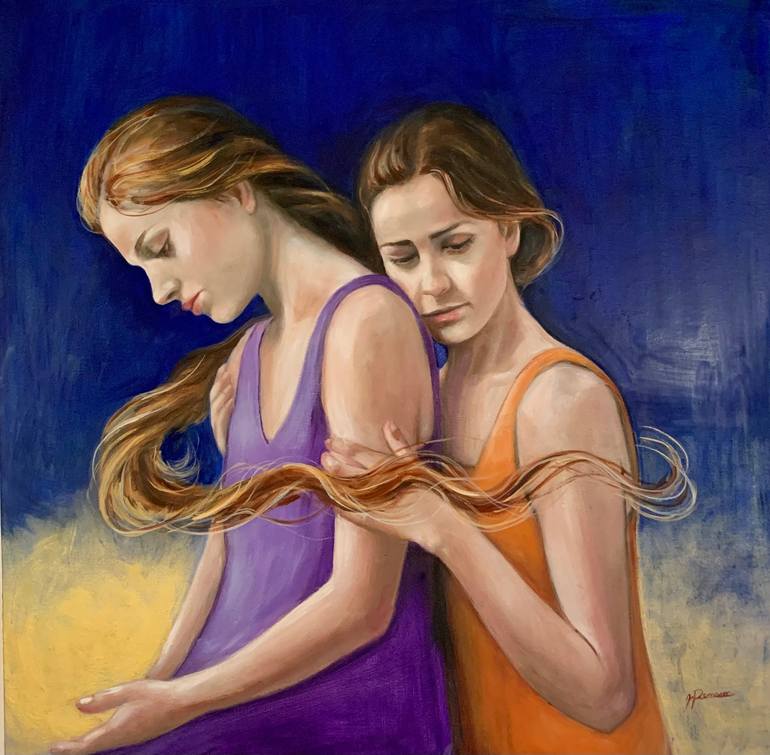 Two girls are in the center of the canvas. The first is seen from behind, in a standing or sitting position, with her shoulders slightly hunched as if she were carrying an emotional weight. The second, behind her, softly rests her head between the shoulder blades of the first, with a melancholic exp...