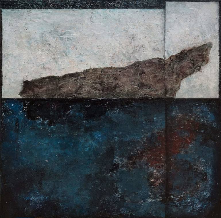 Abstrakt artwork made in levkas technique (wood, pavolaka, chalk prime). Painting depicts shape which reminds shark, blue sea and ice on background.