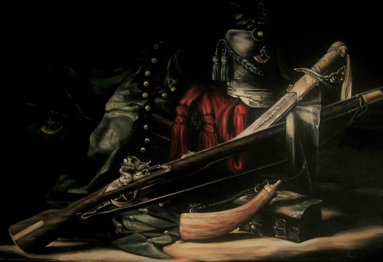 Inspired by Sharpe's Rifles, a TV series about the 19th century war between Great Britain and France. Painted in the traditional style this canvas depicts the uniform, musket, sword and powder keg used by the Officer. The British unit was the South Essex