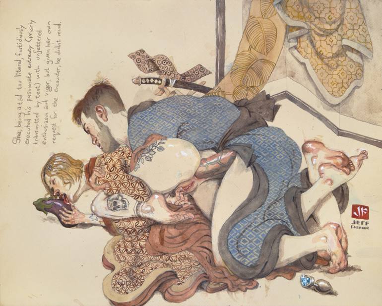 complete title: She, being a tad too literal, fastidiously executed his passionate entreaty (priorly transmitted by text) with unfettered enthusiasm and vigor, but given her own request for the encounter, he didn’t mind. This is a mixed media piece (acrylic, ink and pencil) on acid-free matte board...