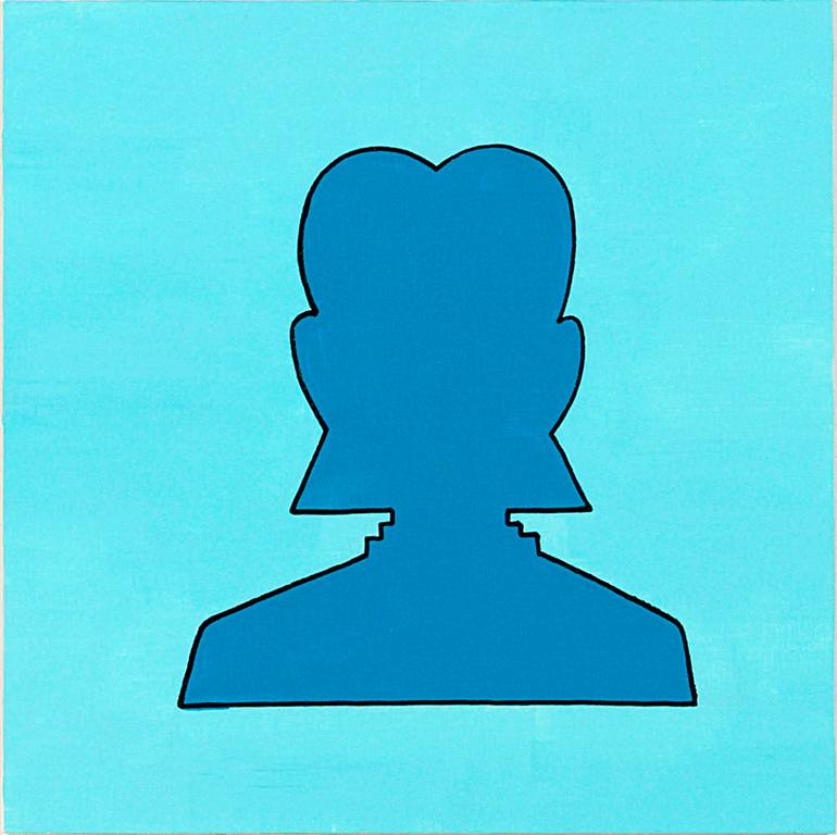 A portrait of a young woman in navy blue and cyan with a classic haircut and wearing a turtleneck sweater. The piece is inspired by typical general social media profile icons.