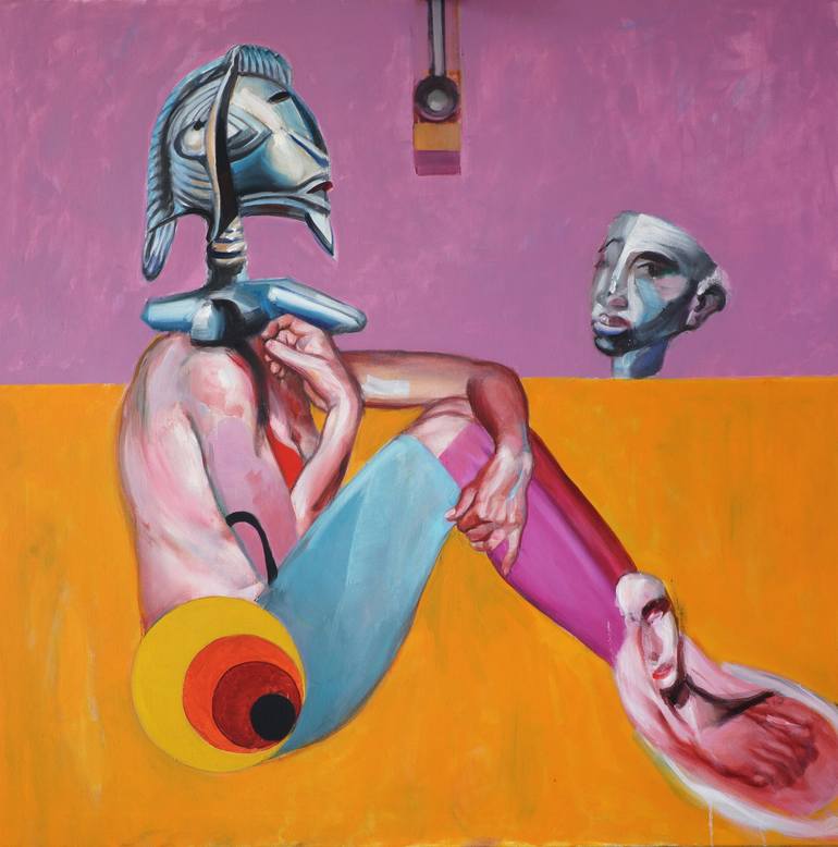 women's figure is made up of collage-like parts. This is a woman figure with an African statue head.