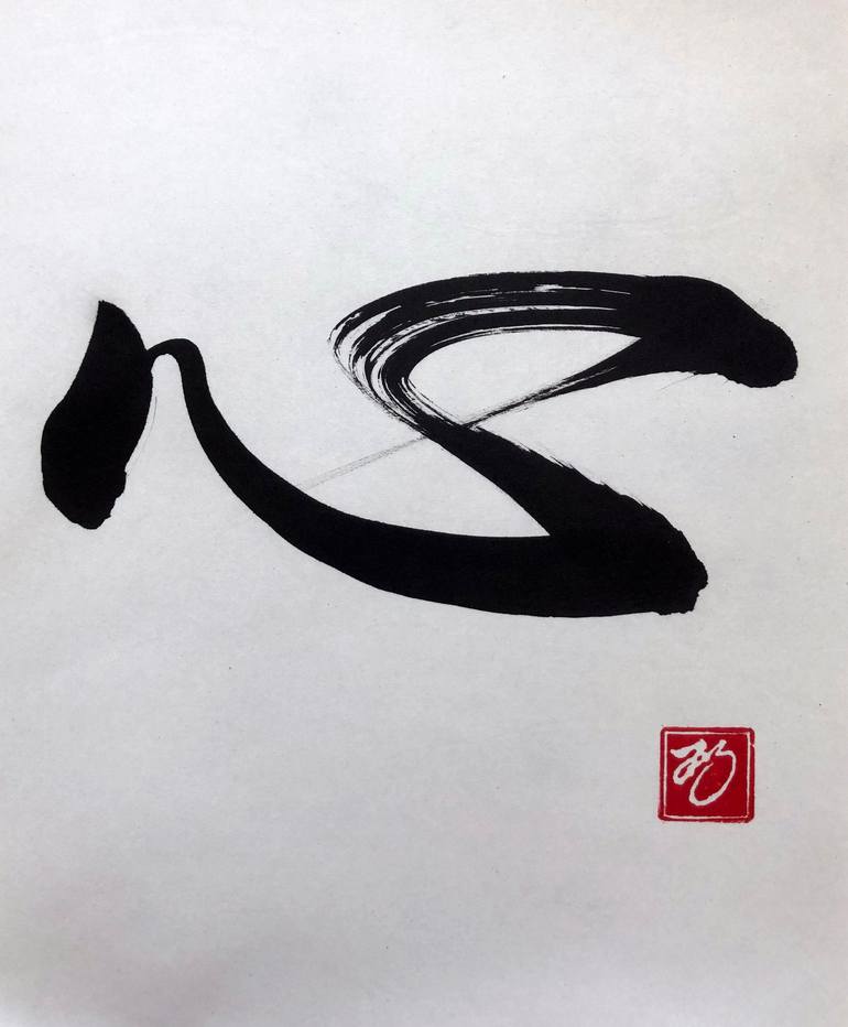 Shin meaning heart, mind or spirit. Japanese calligraphy original artwork signed, ink on xuan paper, wet-mounted and unframed. One theory is the character depicts a watchful tillerman on a long boat. The idea being keeping the mind present while manning the tiller, not wandering with thoughts of w...