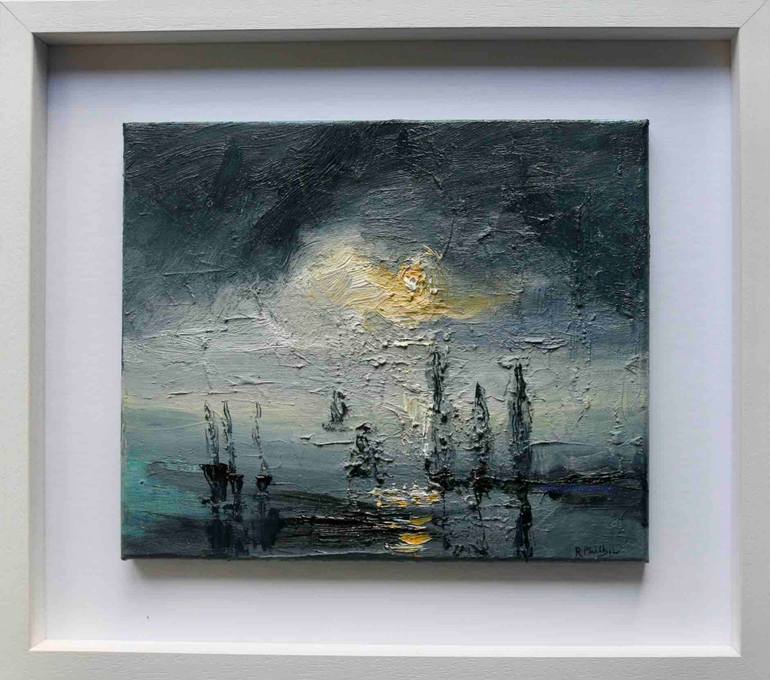 Ships in the moonlight are always an intriguing sight. Mysterious and beguiling, the viewer is pulled in to the atmospheric seascape. Oil on canvas. Framed in solid wood. Impressionistic style.