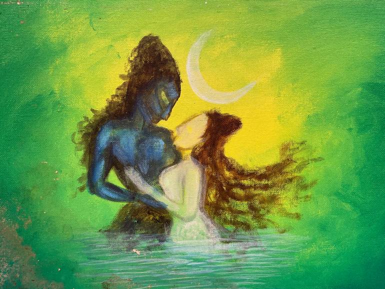 Thank you and welcome to this romantic piece of Shiva and Parvati in water. In this painting, Shiva gently holds Parvati's waist, while she lovingly rests her hand on his chest. The white moon shines in the background, casting a serene glow over the yellow and green landscape. Their faces are blurre...