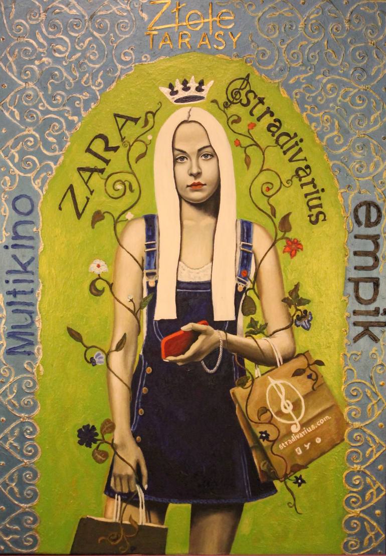 Sylwester Chrapowicz (born 1973) - sociologist and pedagogue. His passion is painting, film and photography. He studied fine arts in Israel. In the mid-1990s, his debut oil paintings come in the form of large formats, Judaic and Christian symbols as well as "lace" golden ornamentation. He prepared negatives for the sculptures of Israeli artist Yorini Nahman. He presented his paintings twice at individual exhibitions (1997 and 1998) and at two collective exhibitions with auctions (1999 and 2000) in Tel Aviv. He exhibited his works at home and abroad. Participant of the final exhibition of the 42nd Biennale of Painting "Bielska Jesień 2015", WOAK Białystok 2015, BWA Bielsko Biala 2016, and the Museum of North-Mazowsze in Łomża 2017. In his works, the artist combines the richness of ornaments drawn from medieval codices with the style of contemporary advertising, and refers to ubiquitous consumerism. The aim of his work is to capture sociological and economic changes taking place in Poland over the last decade, when modern media media replace human relationships. The captured frame in the pictures shows real situations such as shopping, text messaging, and using a smartphone. The brand names rewritten in images fulfill several functions: they define time, place, fashion trends, show ubiquitous advertising, market globality, and in combination with ornament and saturated color they reflect the atmosphere of the shopping gallery. You get the impression that today's shopping malls are modern churches that, instead of eternal life, offer a life of luxury and prosperity, here and now.