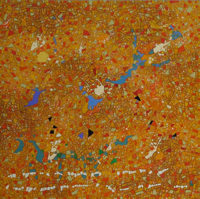 unique mosaic like style and self-invented technique , done with oil on canvas.thousands of individually touched fragments...