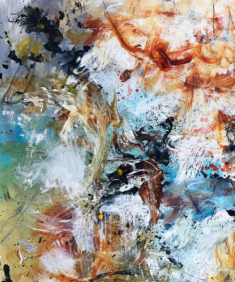 Extra large painting with bold colors and emotional brush strokes. This painting is created through a repetitive process, through which I build then destroy, erase, cover with new colors and shapes. This apparent chaos returns repeatedly to the beginning of the painting, as a kind of rebirth, but th...