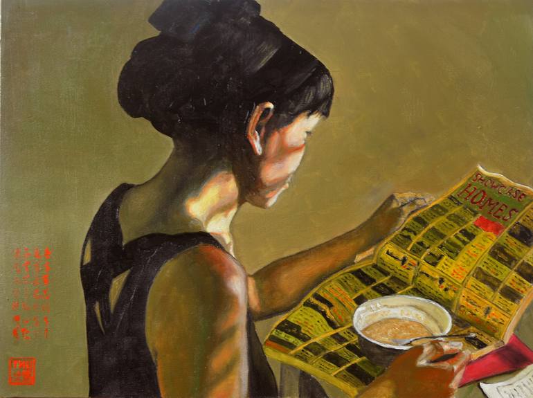 Thu Nguyen's "Showcase Homes Casas Escaparate" captures a quiet moment of solitude with remarkable detail. Bathed in gentle sunlight, a woman is depicted enjoying her breakfast and newspaper, the scene radiating a sense of peacefulness and calm. The artist's skillful use of soft, warm tones enhances...