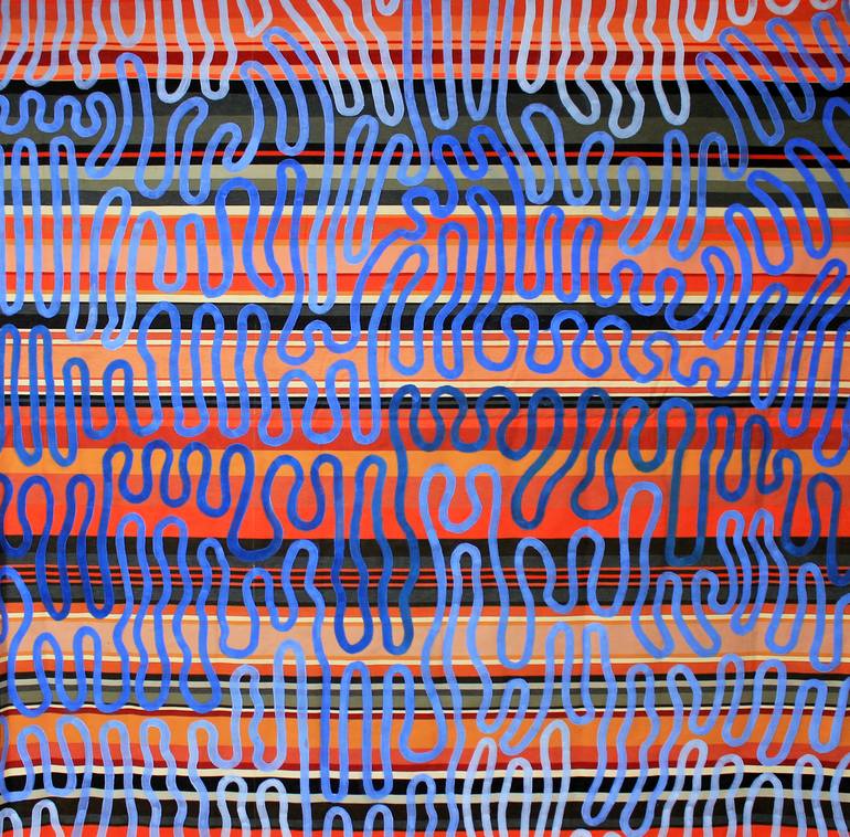 Shubatiki is a reflection on music as energy vibration permeating through a space. Created on loose, flowing cotton fabric, large strokes of blue paint permeate as waves through a field of orange stripes. The painting invites the viewer to reflection upon the concept of energy as the unifying force ...
