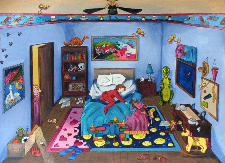 The sister exacts her own counter attack with the help of some fairies, who sneak into the brother's room in the middle of the night and start magically turning the room into something more to the sister's taste! Acrylic and ink on watercolor paper.