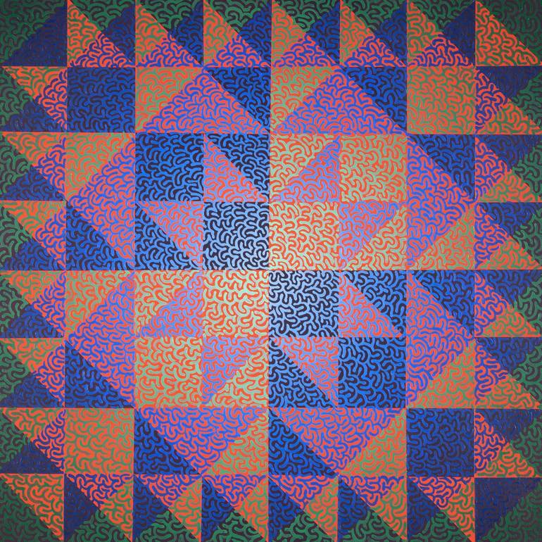 Thousands of hand-painted marks of color on the foreground interacting with a background underpainting. In this piece, a several "Sierpinski Triangle" fractals are laid out so that the underpainting fractal interacts with the fractal at the higher layer. The viewer is invited to linger over the vari...